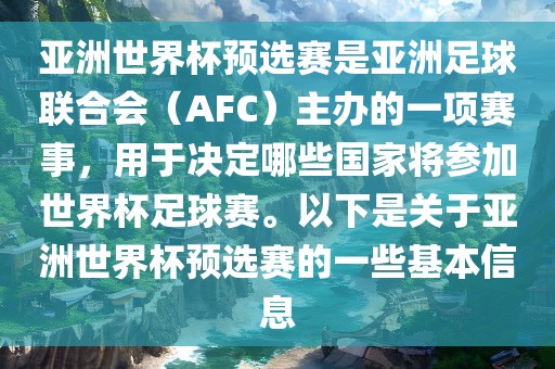 亚洲世界杯预选赛是亚洲足球联合会(AFC)主办的一项赛事,用于决定哪些国家将参加世界杯足球赛。以下是关于亚洲世界杯预选赛的一些基本信息