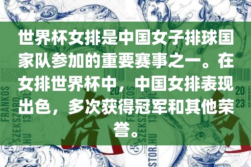 中国女排是一支实力强大、备受关注的队伍,在世界杯女排比赛中也有着非常出色的表现。