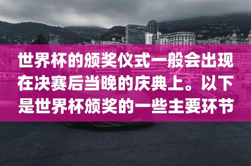 世界杯的颁奖仪式一般会出现在决赛后当晚的庆典上。以下是世界杯颁奖的一些主要环节