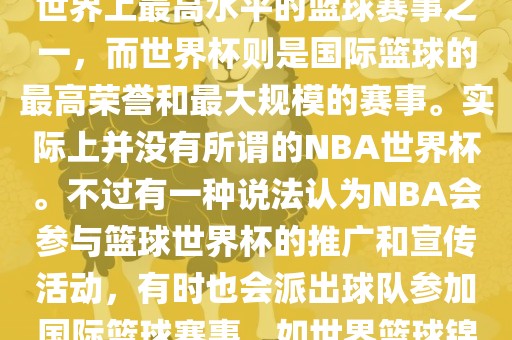 NBA(美国职业篮球联赛)是世界上最高水平的篮球赛事之一,而世界杯则是国际篮球的最高荣誉和最大规模的赛事。实际上并没有所谓的NBA世界杯。不过有一种说法认为NBA会参与篮球世界杯的推广和宣传活动,有时也会派出球队参加国际篮球赛事,如世界篮球锦标赛等。