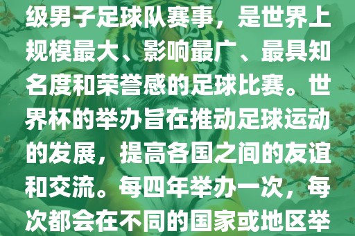 世界杯,全称国际足联世界杯(FIFA World Cup),是由国际足球联合会主办的一项国家级男子足球队赛事,是世界上规模最大、影响最广、最具知名度和荣誉感的足球比赛。世界杯的举办旨在推动足球运动的发展,提高各国之间的友谊和交流。每四年举办一次,每次都会在不同的国家或地区举办。世界杯的历史可以追溯到1930年,至今已经举办了二十几届。