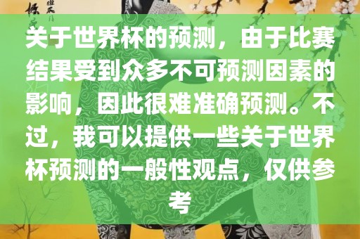 关于世界杯的预测,由于比赛结果受到众多不可预测因素的影响,因此很难准确预测。不过,我可以提供一些关于世界杯预测的一般性观点,仅供参考
