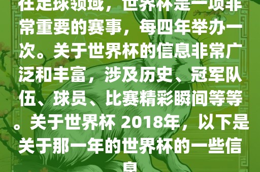 在足球领域,世界杯是一项非常重要的赛事,每四年举办一次。关于世界杯的信息非常广泛和丰富,涉及历史、冠军队伍、球员、比赛精彩瞬间等等。关于世界杯 2018年,以下是关于那一年的世界杯的一些信息