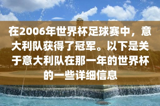 在2006年世界杯足球赛中,意大利队获得了冠军。以下是关于意大利队在那一年的世界杯的一些详细信息