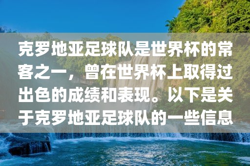 克罗地亚足球队是世界杯的常客之一,曾在世界杯上取得过出色的成绩和表现。以下是关于克罗地亚足球队的一些信息