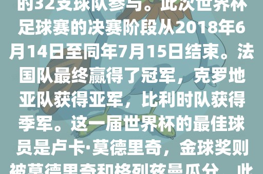 摘要:2018年俄罗斯世界杯是第21届足球赛事,全球32支球队参与。法国队赢得冠军,克罗地亚和比利时分别获得亚军和季军。最佳球员为卢卡·莫德里奇,金球奖被莫德里奇和格列兹曼分享。该届世界杯创造了多项纪录和亮点,观众人数创新高。