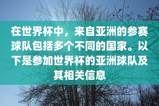 在世界杯中,来自亚洲的参赛球队包括多个不同的国家。以下是参加世界杯的亚洲球队及其相关信息